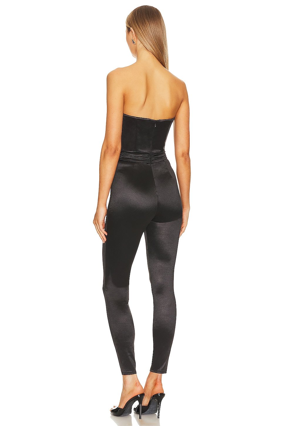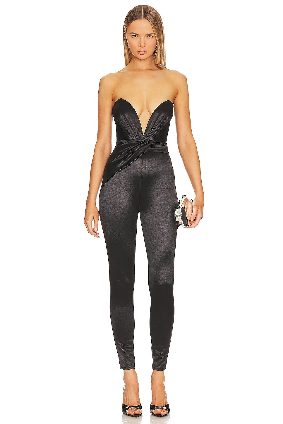Step out in style in the NBD Castanha Jumpsuit in Black. With a hidden back zipper closure and V-wire front, it is crafted from lightweight satin fabric. Your go-to for a sexy, chic look for a night out.