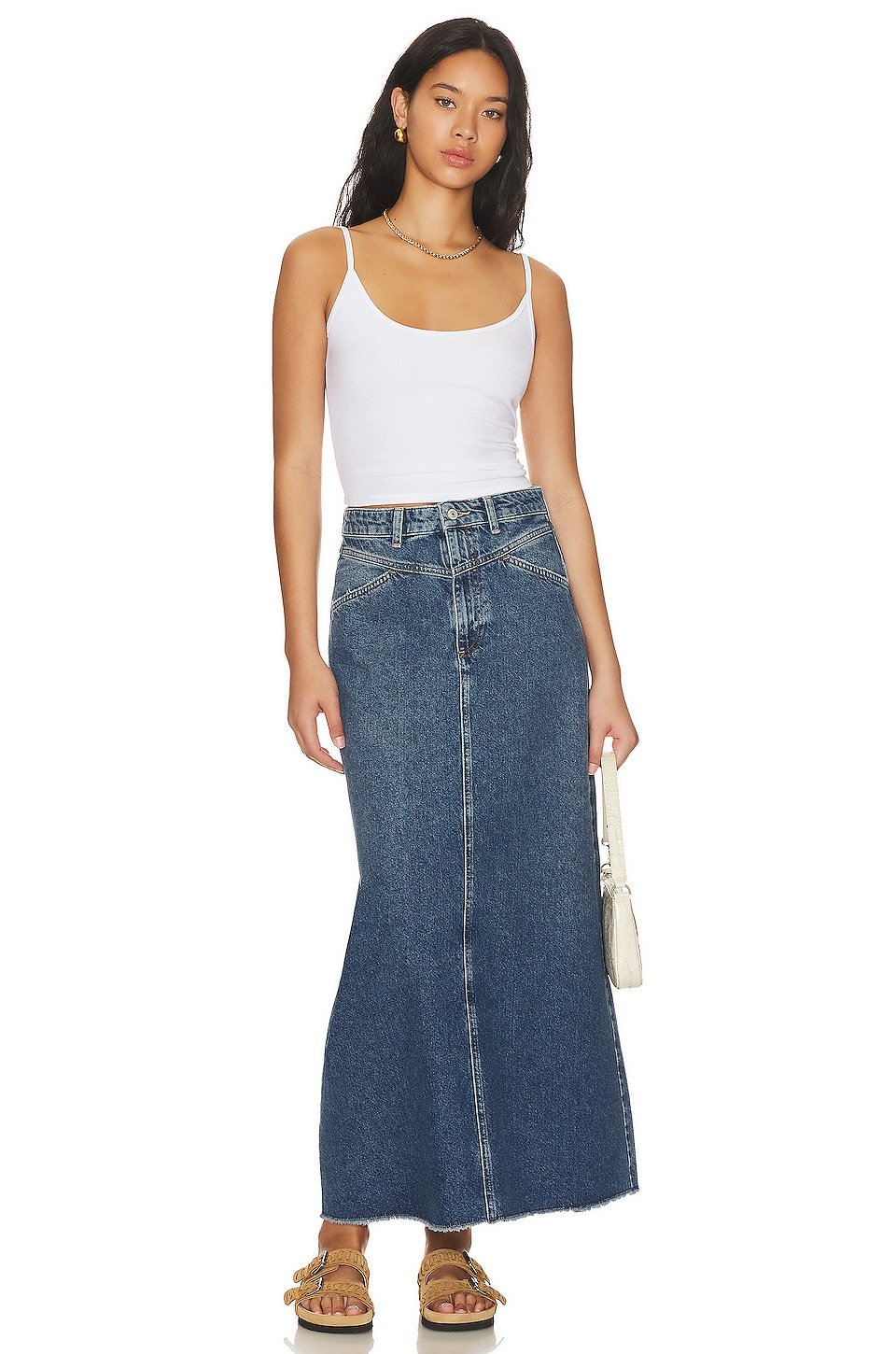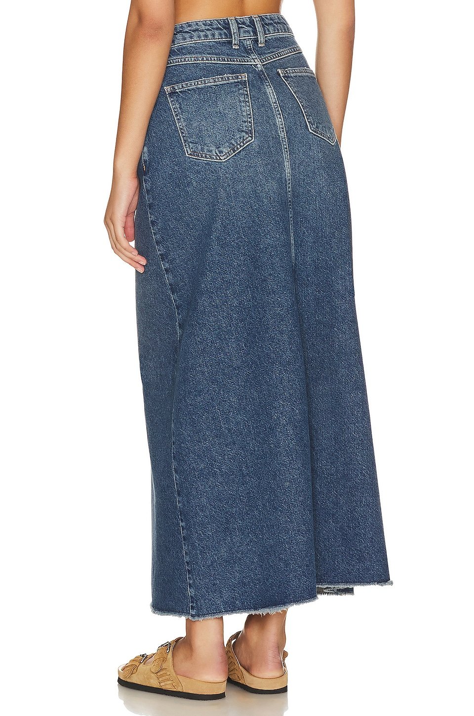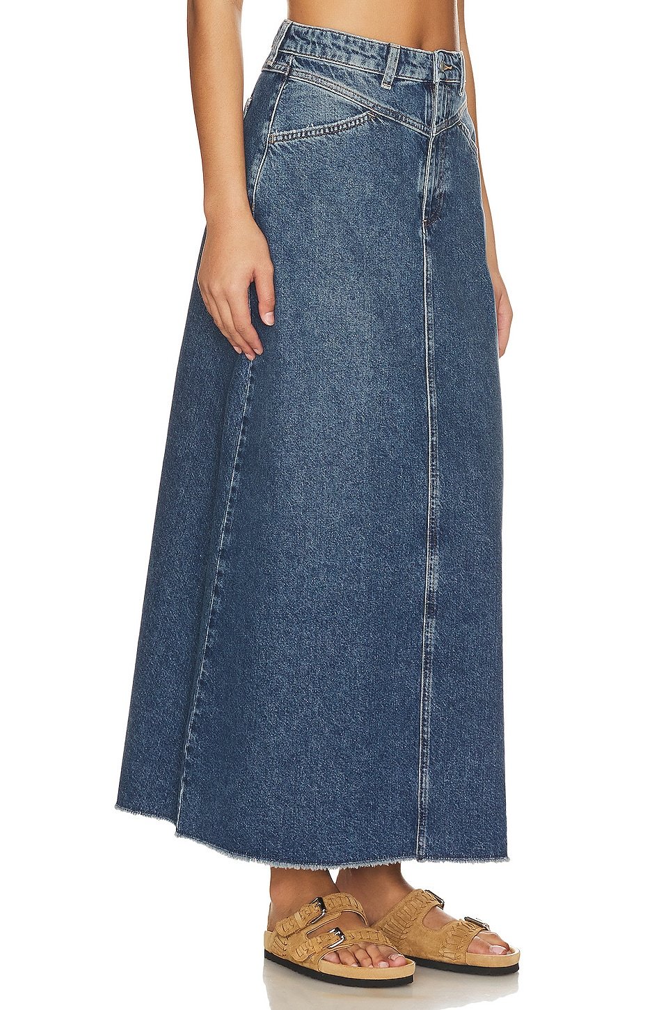 Midweight denim fabric with frayed raw-cut hem