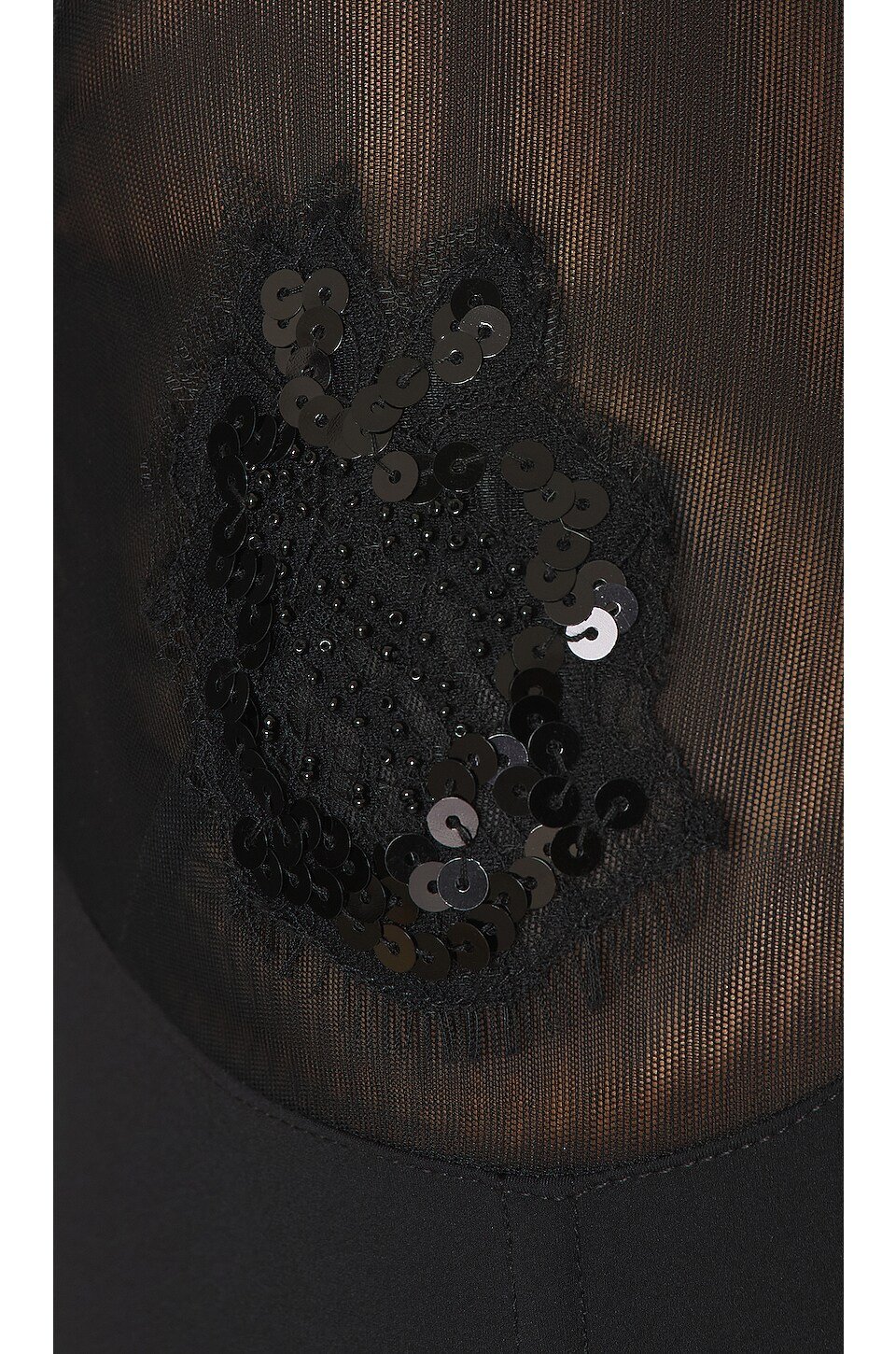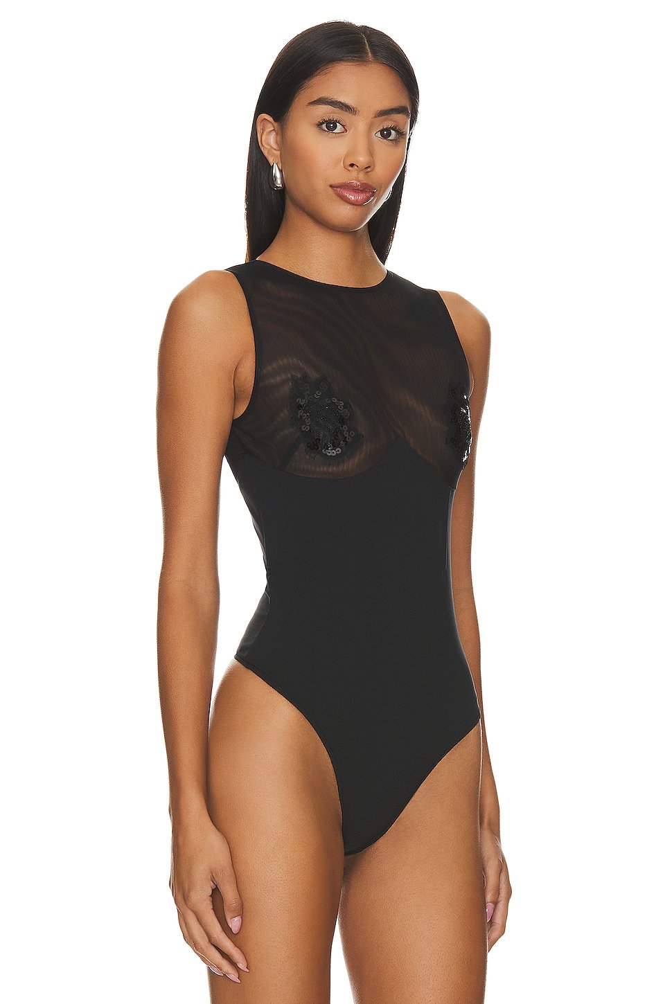 Jersey and mesh fabric with sequin and beaded detail at bust