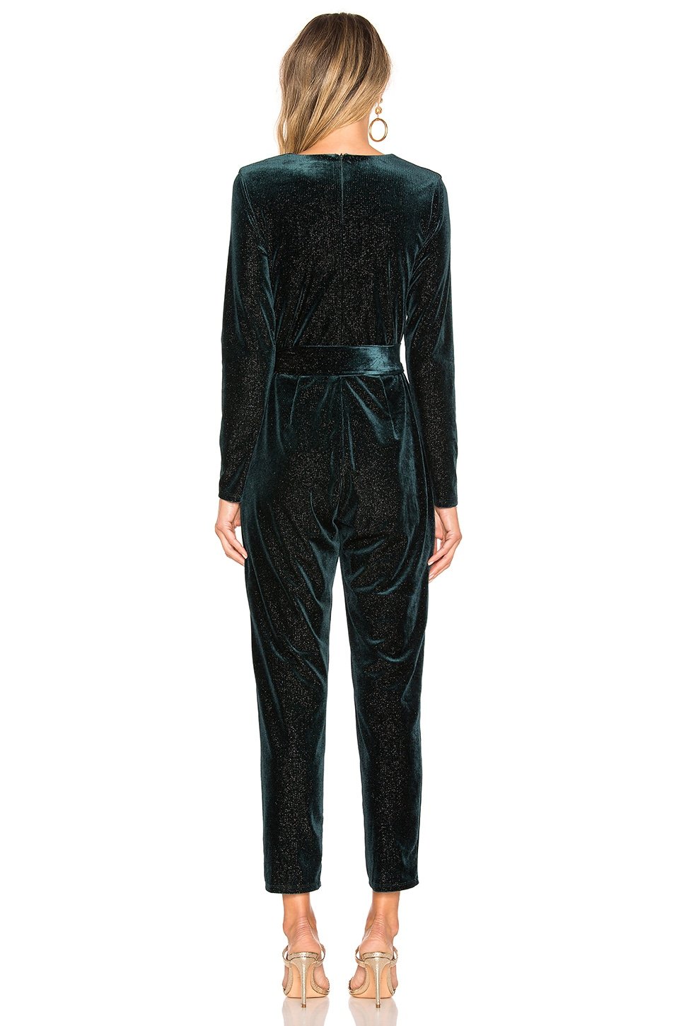 Sleek and high in glamour is the Hart Jumpsuit by Lovers + Friends. Gathered at the waist by a wide sash, the rich velvet design features flecks of metallic threading that shimmer with the slightest movement.