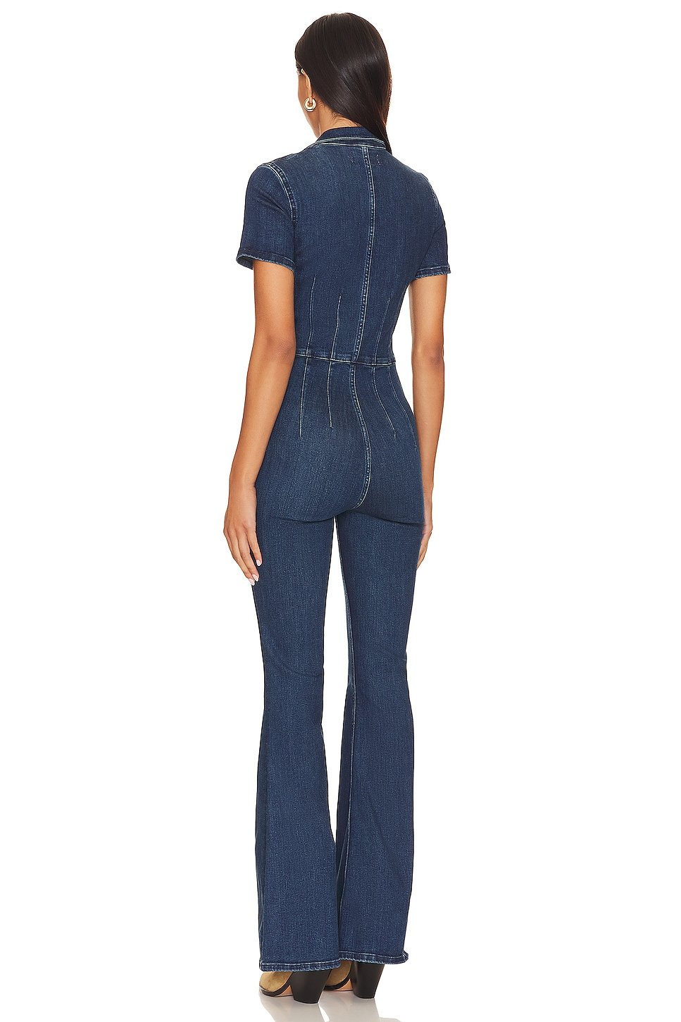 Elevate your casual chic style with Free Peoples Night Sky Jayde Flare Jumpsuit. With its stretch denim fabric, this curve-hugging jumpsuit in a dark wash features a front zipper closure for effortless style.