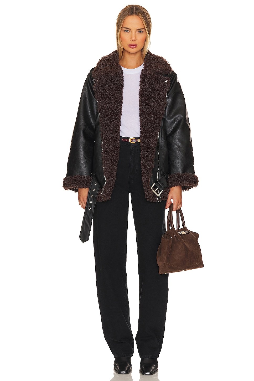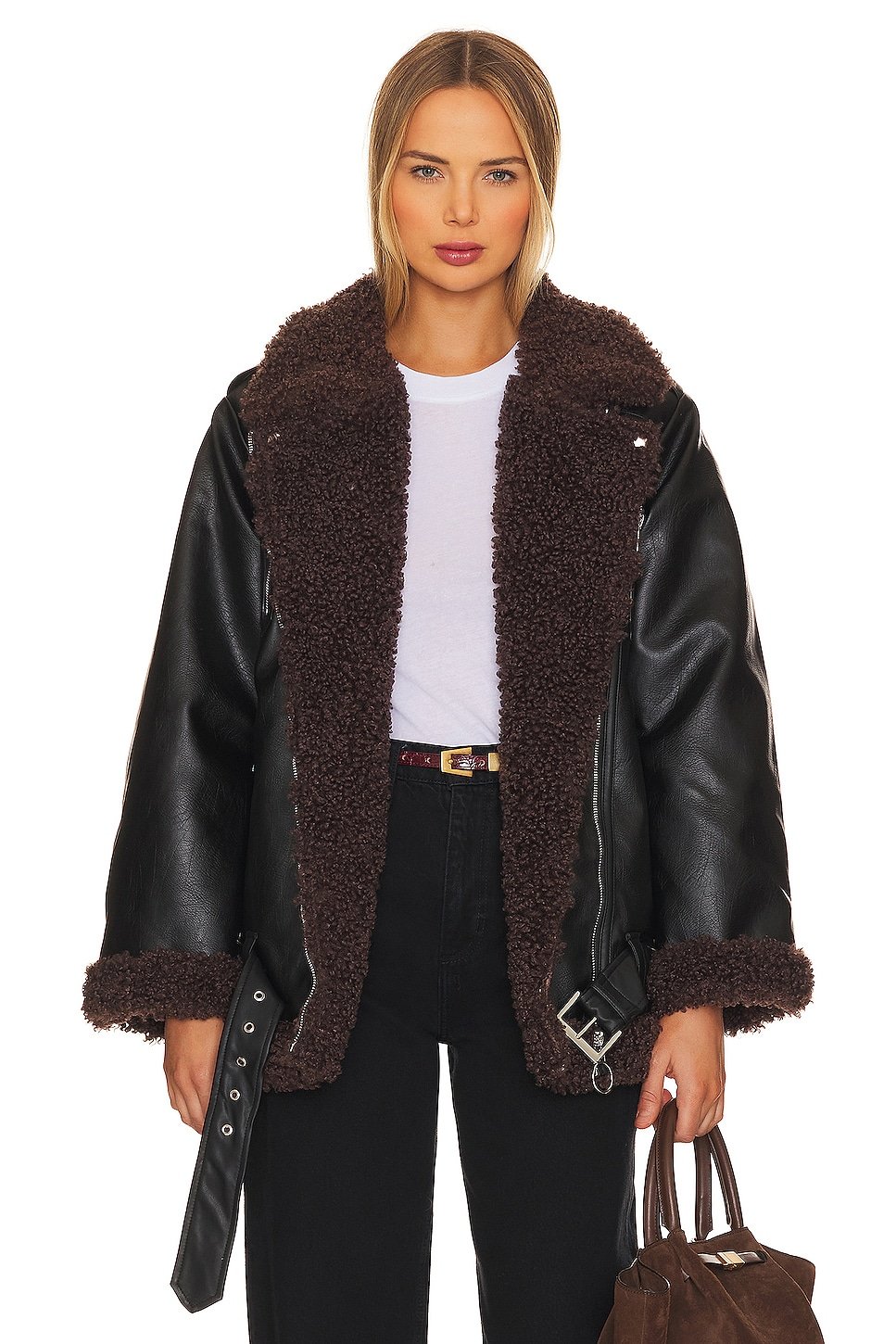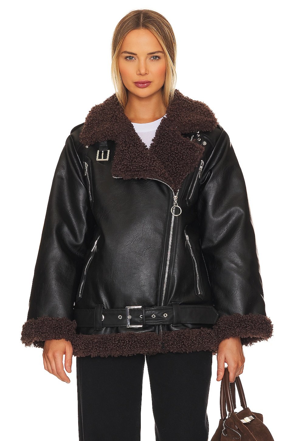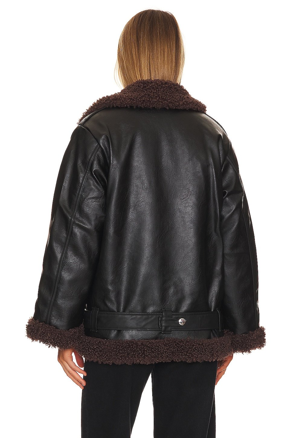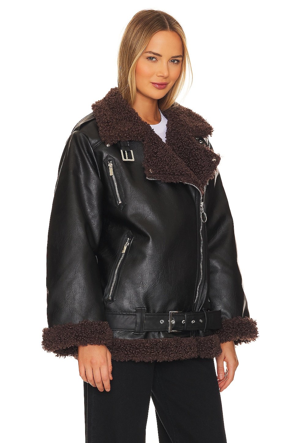 Midweight faux leather fabric with faux fur lining and trim